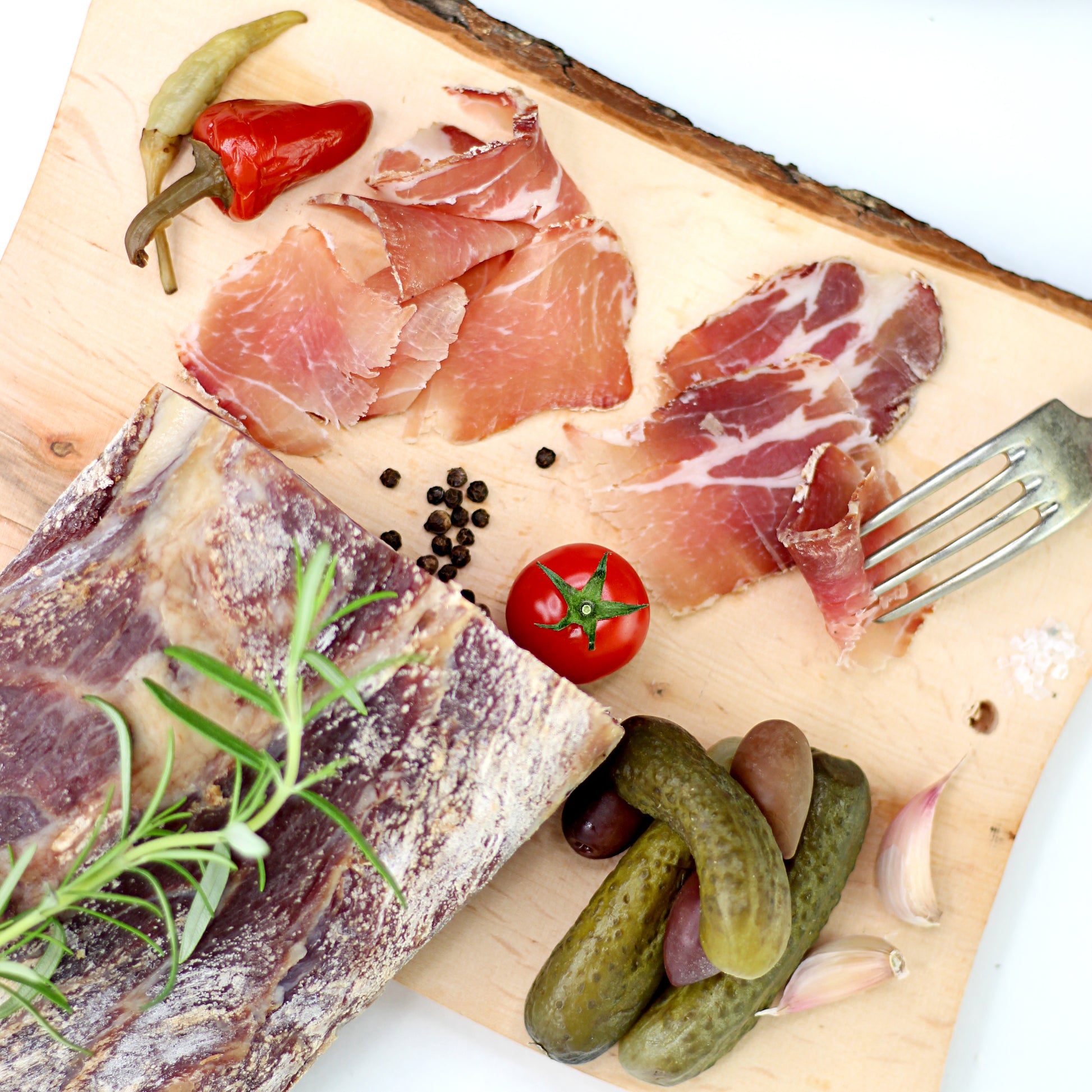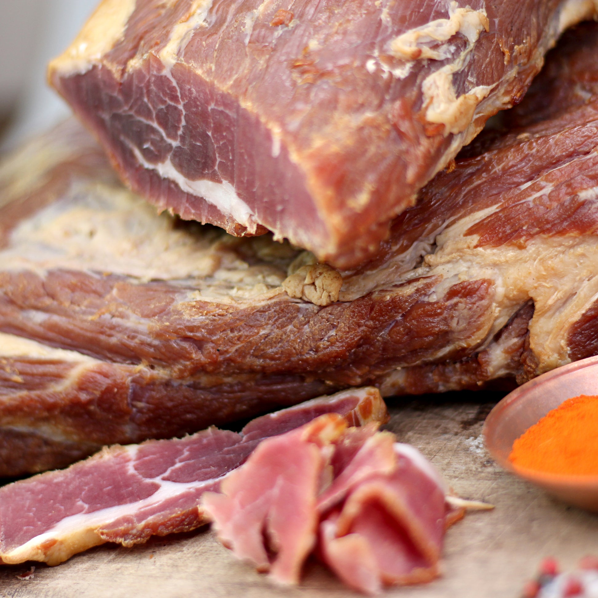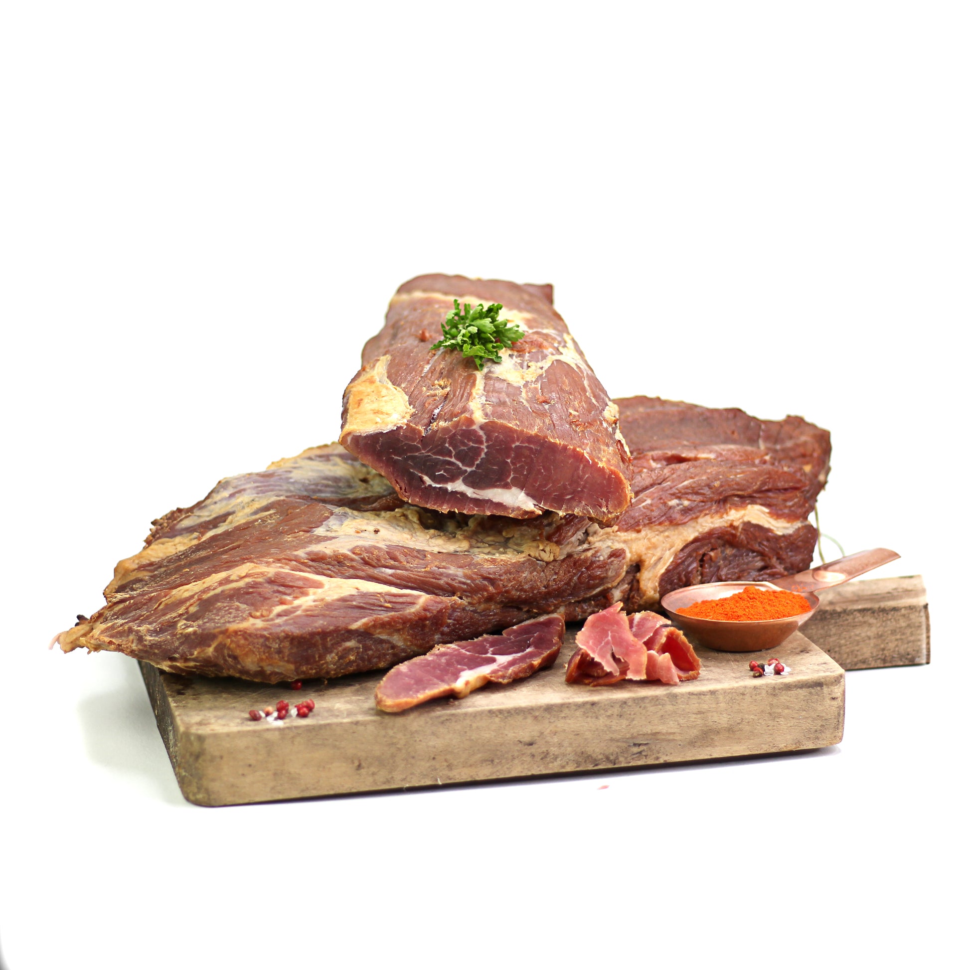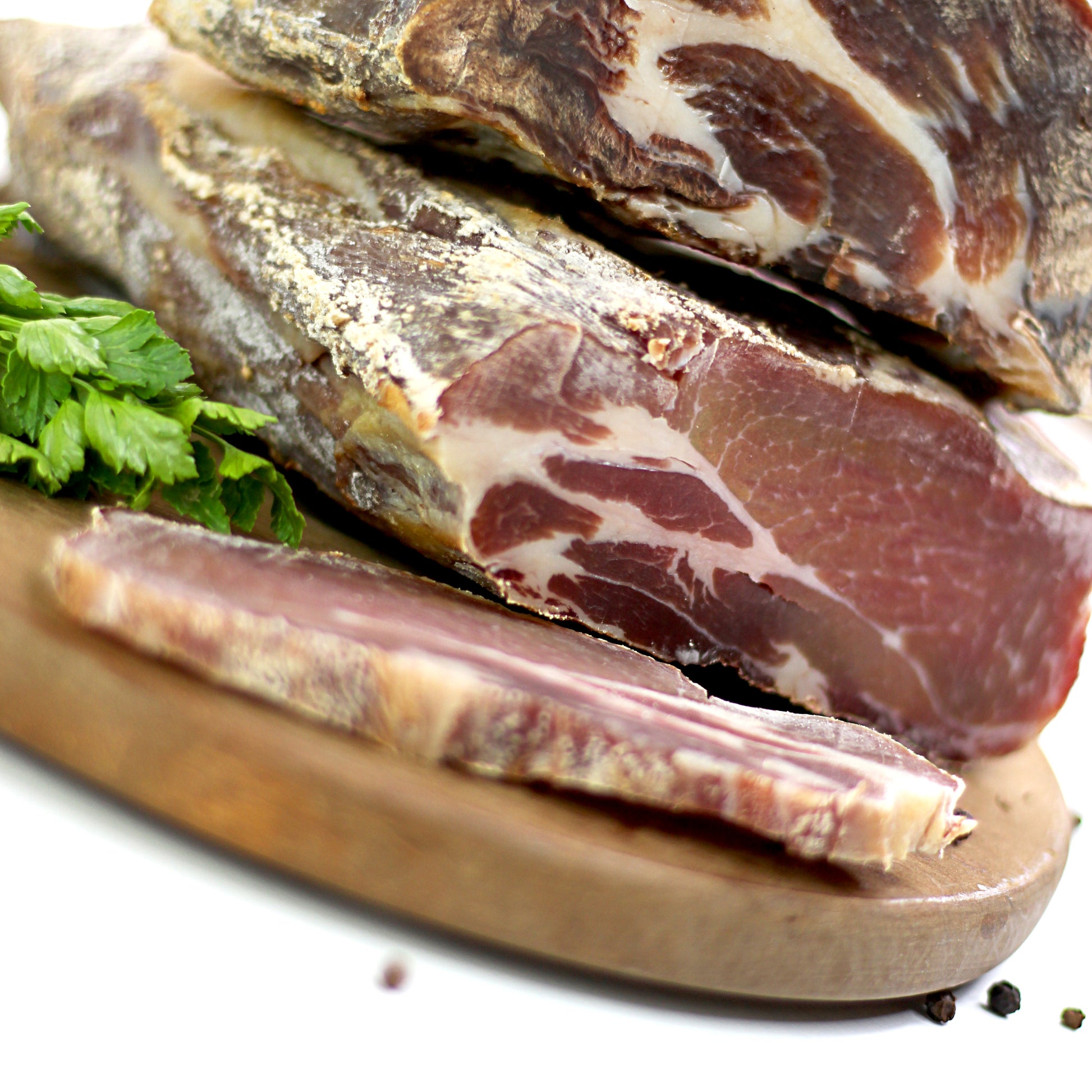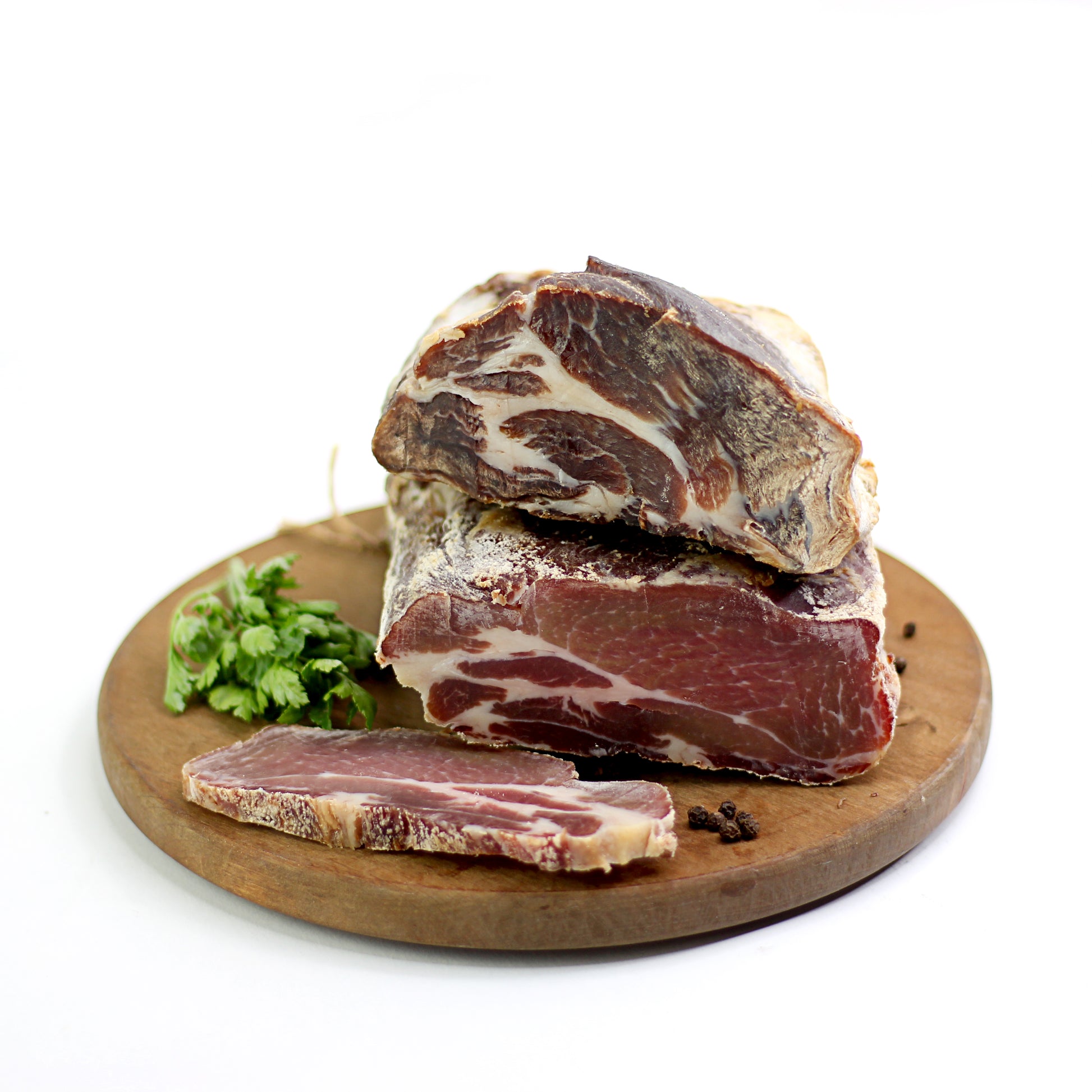 Produs preparat din ceafă de porc ținută în sare și afumată. Materia primă provine din Romania.